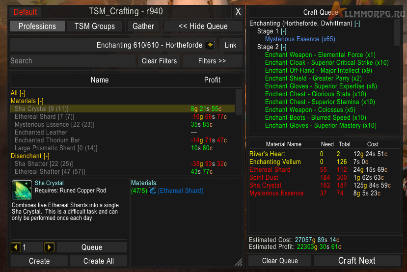 TradeSkillMaster_CraftingTradeSkillMaster_Crafting является дополнительным модулем для TradeSkillMaster. Аддон TradeSkillMaster_Crafting анализирует спрос на определённые рецепты, а так же предлагает создать самые актуальные предметы для продажи. Подсчитывает требуемые реагенты, ищет их на аукционе по выгодной цене. Рассчитывает среднюю стоимость предмета и т.п. |