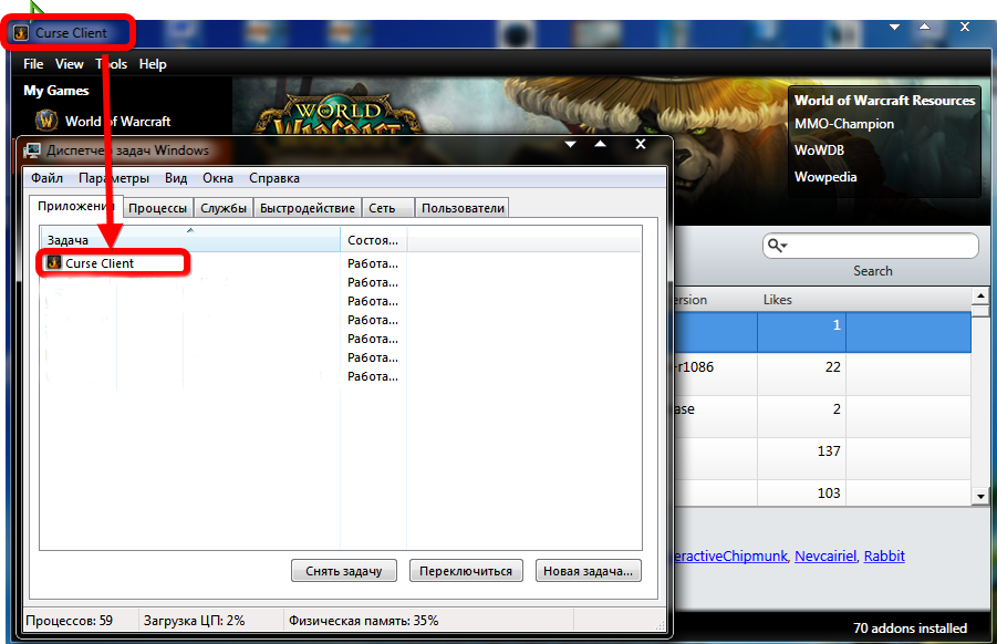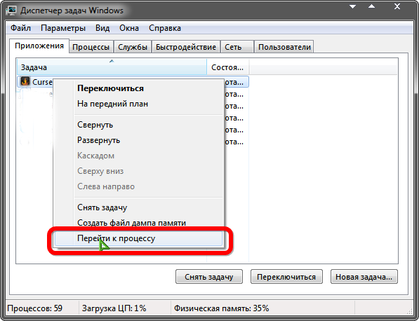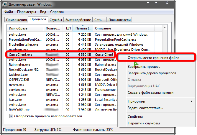- 6) Щёлкаем правой кнопкой мыши по иконке Curse Client и выбираем «Перейти к процессу»;