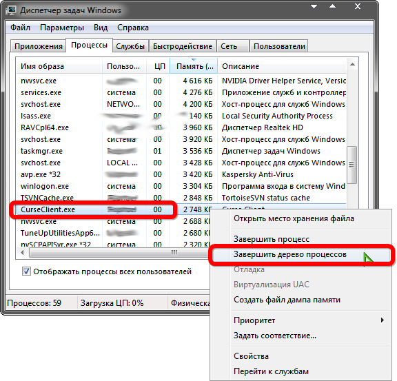 - 9) Щёлкнув по процессу правой кнопкой мыши и выбрать «Завершить Дерево процессов»;