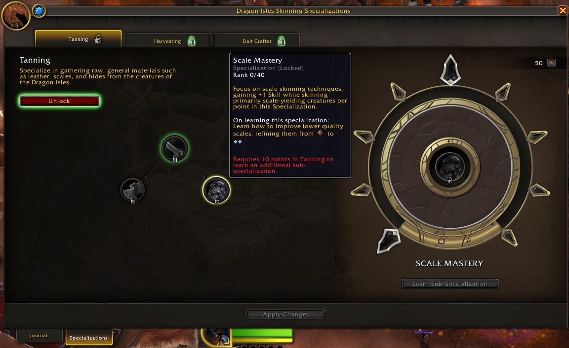 Одно из основных изменений снятия шкур в Dragonflight – появление ремесленных специализаций. Достигнув 25 уровня профессии, вы сможете выбрать любую специализацию по своему желанию и начать развивать ее с помощью специальных очков – Знаний. Они являются наградой за еженедельные квесты, даются за использование Драконьих трактатов и проч.