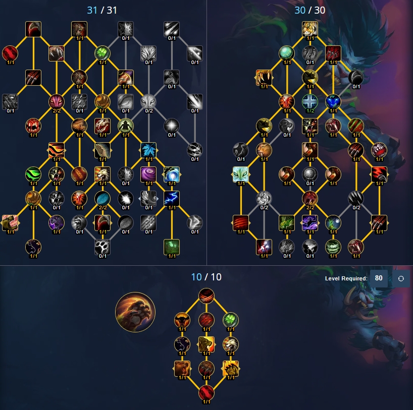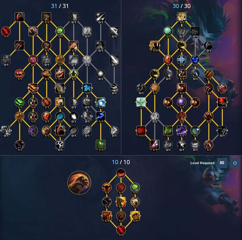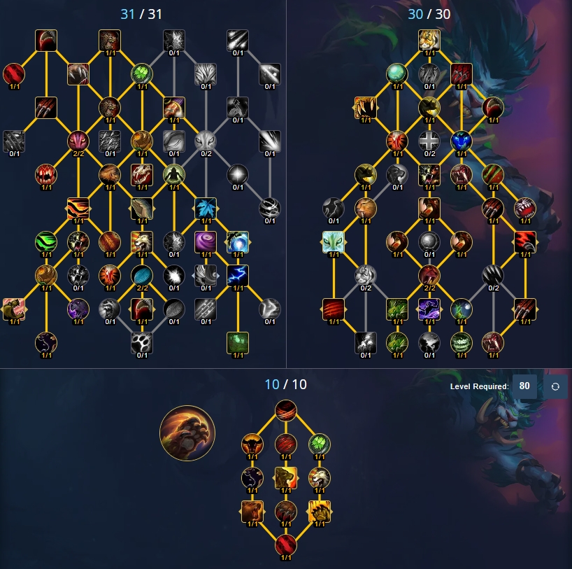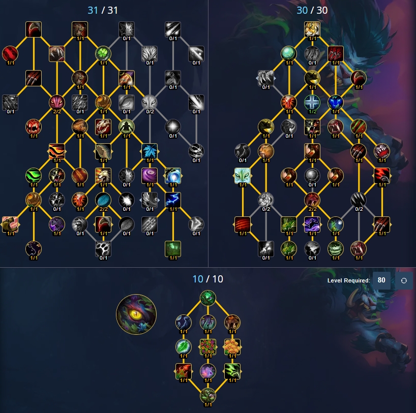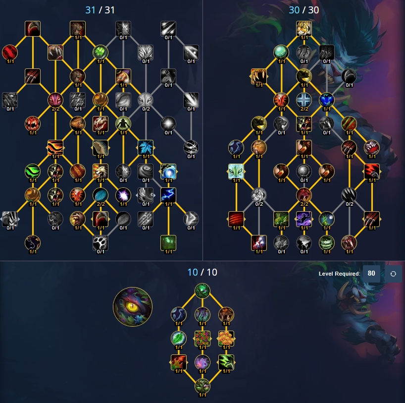 - В обоих билдах присутствуют ключевые АоЕ-таланты, Первобытный гнев и Свирепое буйство. Они распространяют урон от Разорвать и Свирепый укус на дополнительные цели.