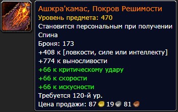 Ашжра'камас, Покров Решимости - это легендарный плащ, добавленный в игру в патче 8.3. Он был создан для противодействия механике порчи.