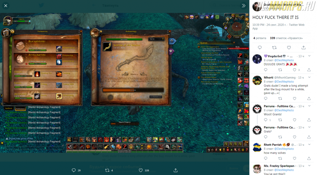 На днях в своем Twitter-аккаунте пользователь под ником DesMephisto похвастался добытым предметом – Ятаган сирокко. Этот редкий предмет могут получить археологи при проведении раскопок в Ульдуме и сборе фрагментов артефакта тол'виров. Ятаган сирокко стал последним одноручным мечом в коллекции игрока.
