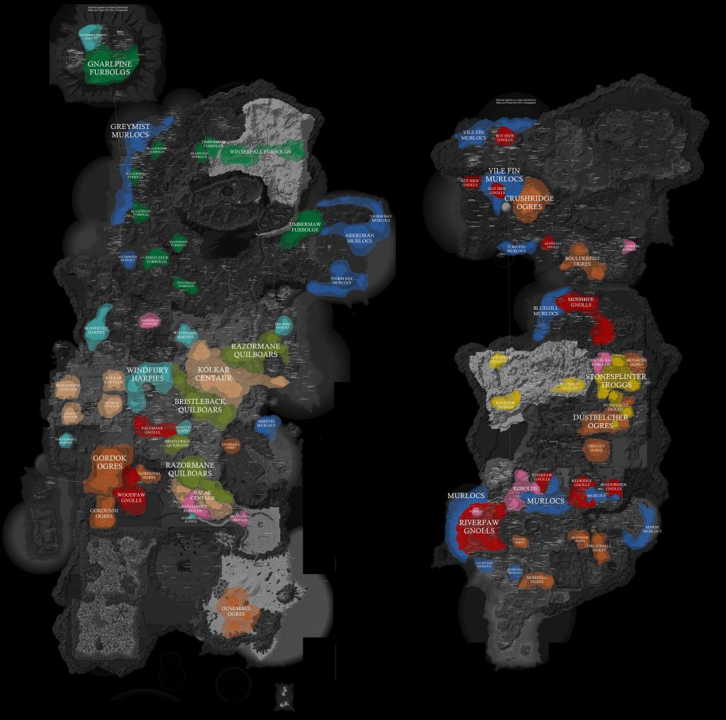 Для начала стоит рассмотреть карту, на которой отмечены территории, принадлежащие менее цивилизованным расам Азерота. К ним относятся иглошкурые, кентавры, гарпии, фурболги и прочие. Многие игроки, наверное, уже забыли об этих существах, но все же будет интересно вспомнить о них и посмотреть, где находятся их поселения.