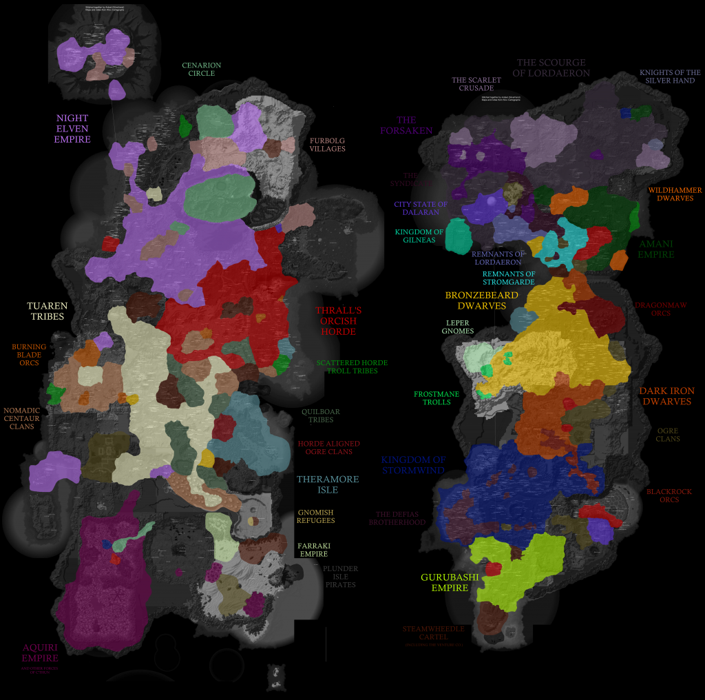 Вторая карта – более привычная для простых игроков. На ней выделены области, принадлежащие расам и племенам, с которыми многие из нас хорошо знакомы. К ним относятся орки, ночные эльфы, гномы и т. д., а также такие фракции как Круг Кенария или Алый Крестовый Поход.