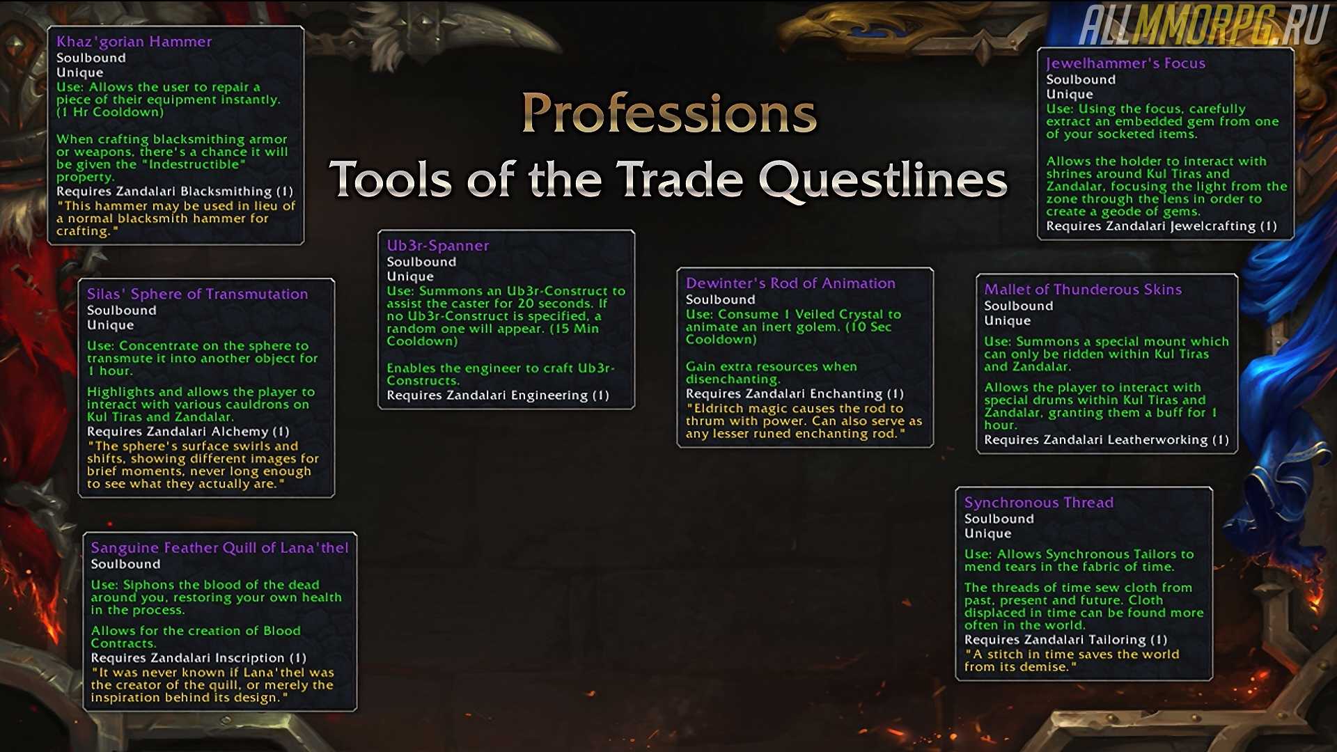 В новом патче будут добавлены задания для профессий, которые позволят игрокам получить инструменты, упрощающие изготовление предметов. К примеру, начертатели получат перо для создания кровавых контрактов и смогут высасывать жизнь из ближайших противников.
