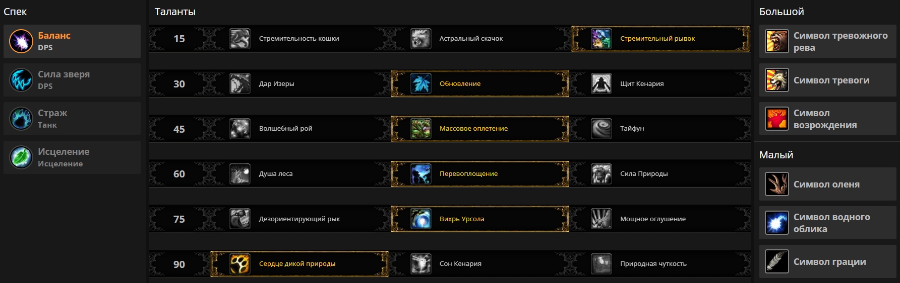 - Сердце дикой природы повышает показатели выносливости, ловкости и интеллекта на 6%, действует постоянно. Активный компонент повышает эффективность действий, связанных с другими ролями, на 45 сек. "Баланс" получает возможность временно танковать в Облике медведя и читать мощные целительные заклинания.