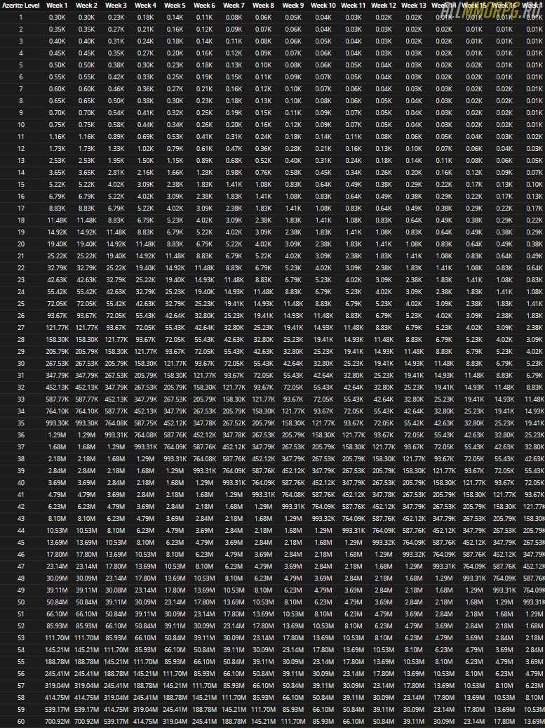 «После 10 уровня каждый последующий азеритовый уровень требует на 30% силы артефакта больше, что позволяет без труда вычислить пороговое значение, выше которого прибавка будет минимальной.» если проверять данные то 30% стабильно с 16 уровня