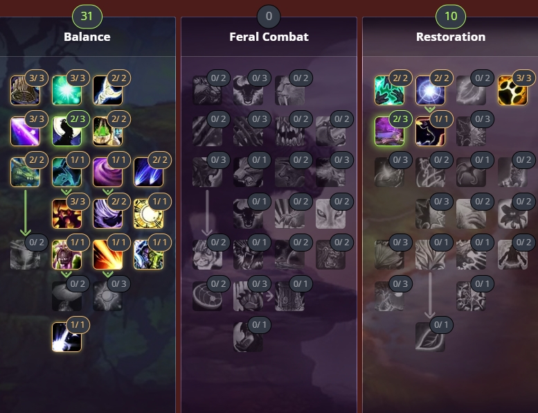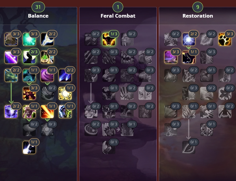 Штормовые ветра усиливают АоЕ-урон. Сотворение увеличивает продолжительность действия периодических эффектов, которые наносят основную долю урона. Лунное сияние - достойное вложение, позволяющее расходовать ману эффективнее. Помимо этого, оно открывает доступ к основному АоЕ-кулдауну, Звездопад.