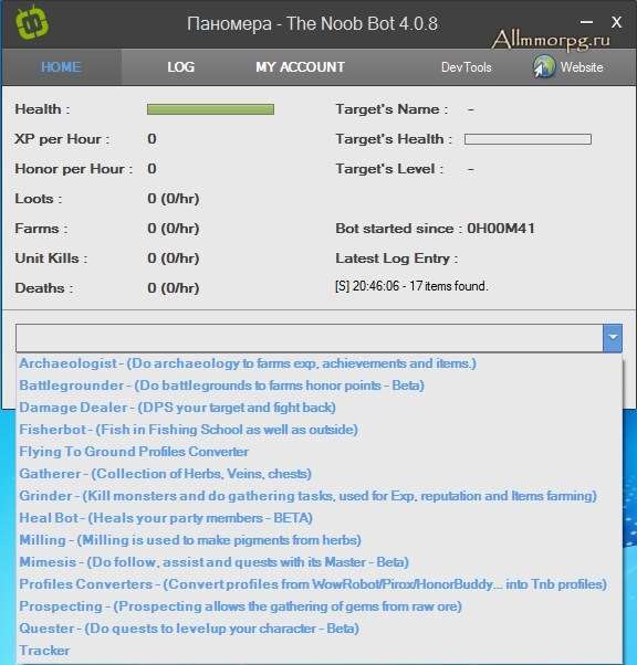 Для тех, кто еще не пробовал эту программу - TheNoobBot остается одним из самых лучших ботов для WoW в вопросах быстрой прокачки персонажей и добычи разнообразных предметов для прокачивания профессий. Проект начал свое существование в 2011, вышел на стадию бета-тестирования 17 февраля 2012 года и спустя шесть месяцев после этого вышел в полноценном виде как релиз. С тех пор он постоянно обновляется под каждое новое дополнение World of Warcraft.Бот поддерживает все версии Windows - от легендарной WinXP до Win8. Установка будет легкой и быстрой - у любой версии бота есть программа-установщик, которая предложит вам воспользоваться оптимизированными настройками. Релиз, представленный на сайте сейчас - бесплатный, с неограниченным временем использования бота. Игровая сессия больше не будет обрываться спустя полчаса!
