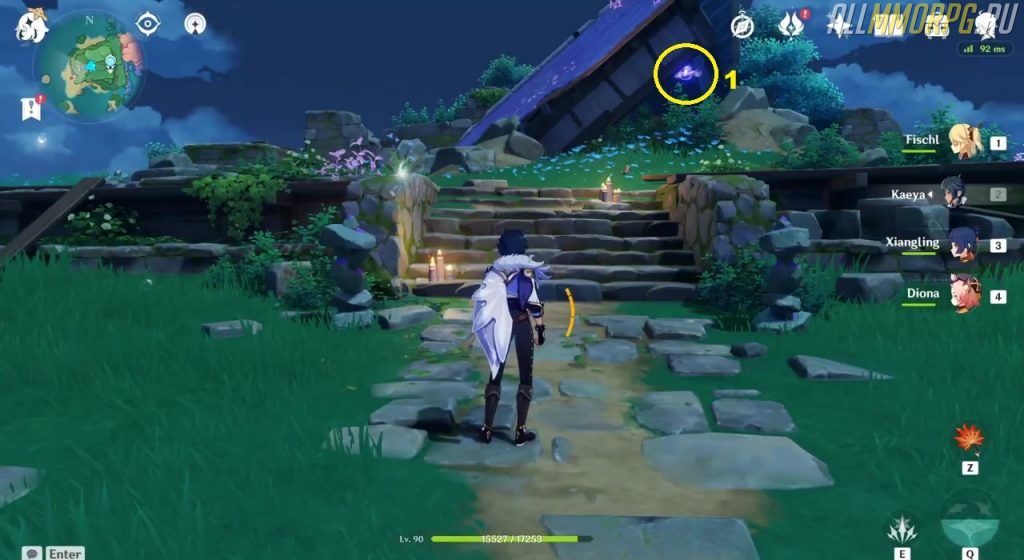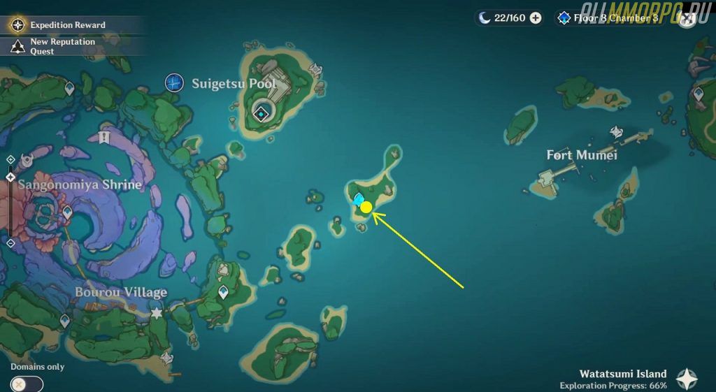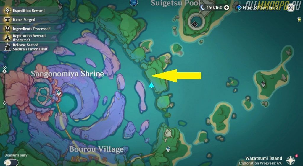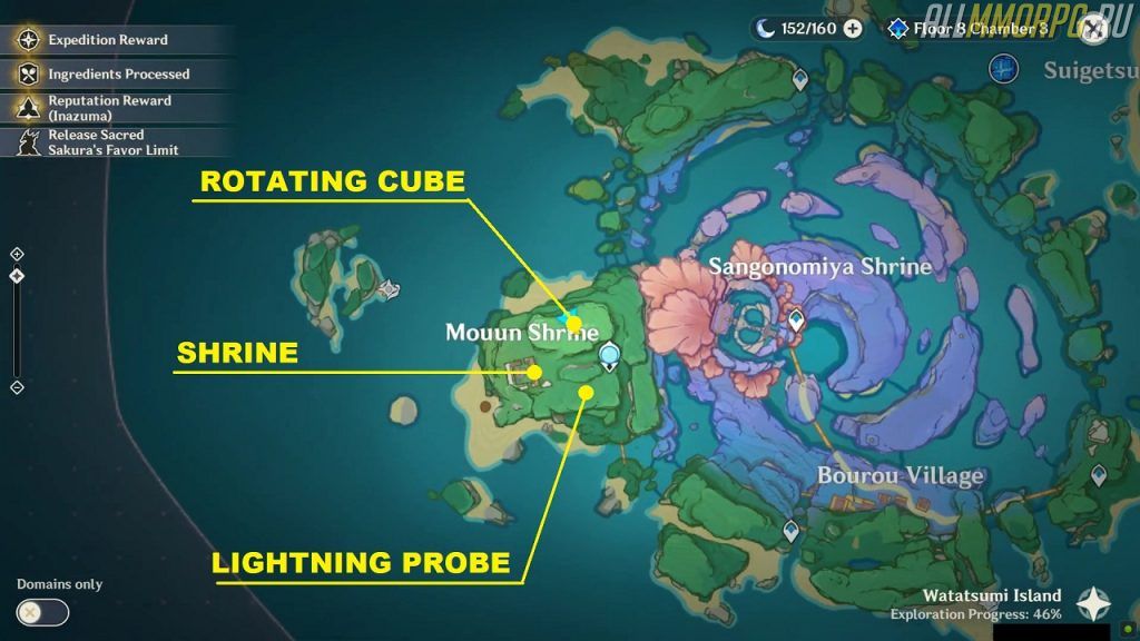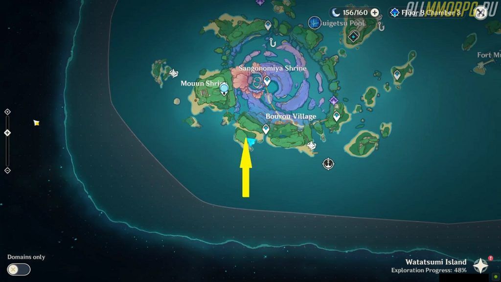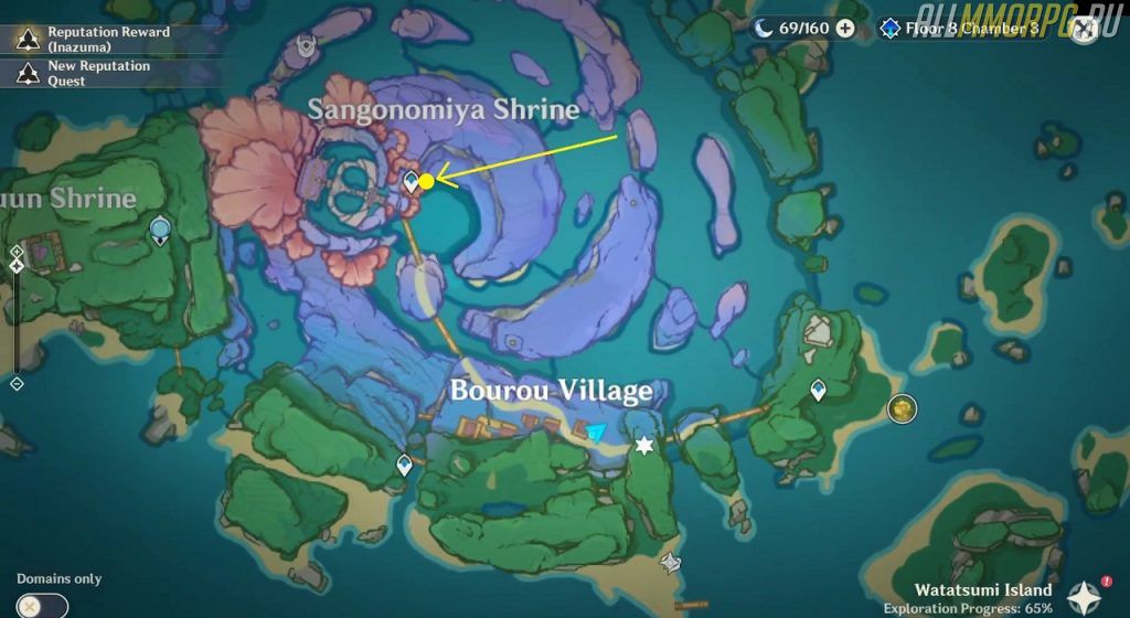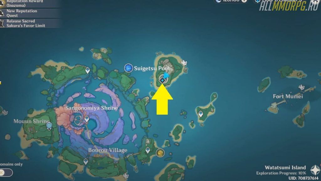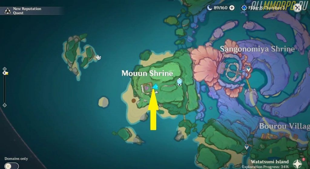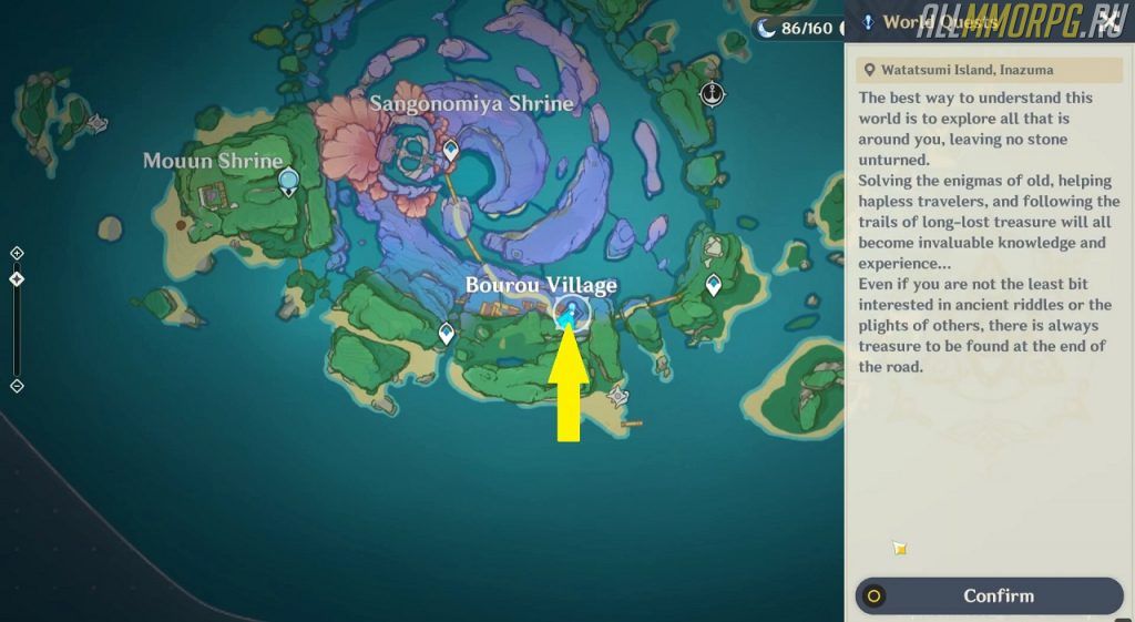 Если вы уже сделали квест «Чудесное растение глубин», обратитесь к старушке еще раз и попросите ее погадать. Комаки расскажет, что вам необходимо посетить наивысшую точку острова, поскольку именно там вас ждет удача. Это место находится в святилище Моун, которое расположено в западной части острова слева от статуи Семи Архонтов.