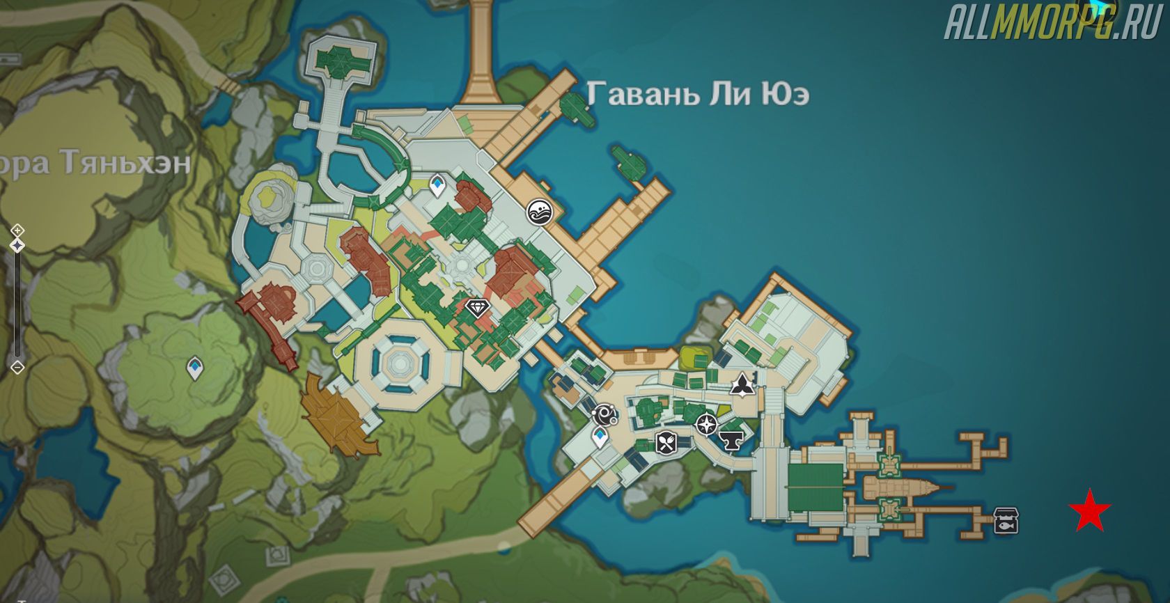 Квест «Океанская жемчужина» выдает девушка по имени Ло Ся. Она находится на корабле, стоящем неподалеку от гавани Ли Юэ. На изображении ниже показано точное местоположение судна.