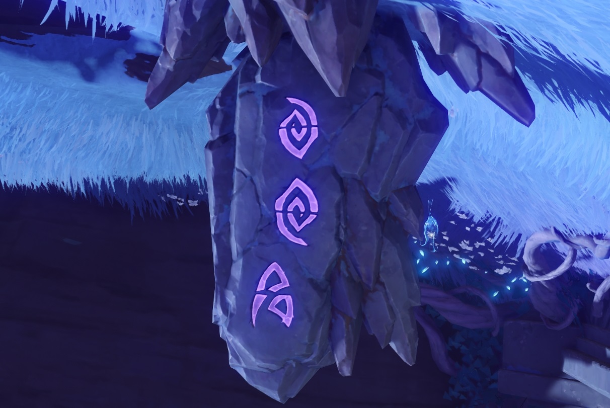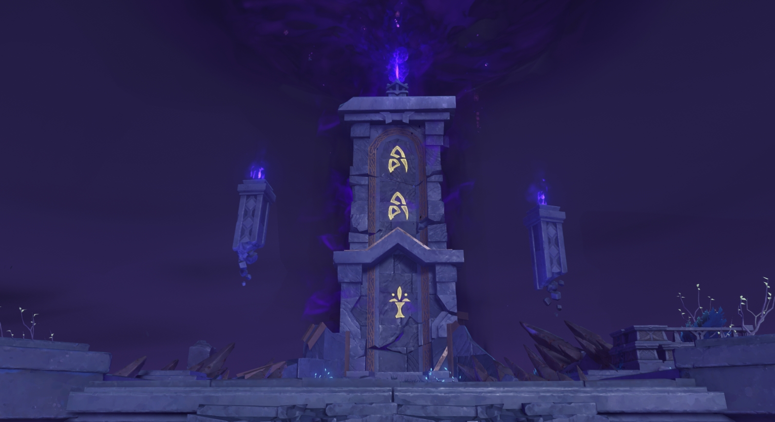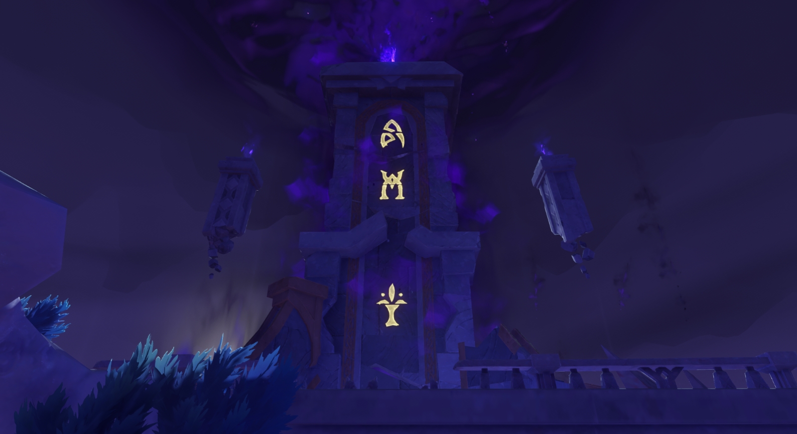 - Теперь вам нужно собрать башню пустоты. Для этого повернитесь лицом к башне и слева от нее возле ступеней увидите монолит с тремя символами, расположенными вертикально. Вам необходимо вращать механизмы так, чтобы на обломках башни выстроились символы в том же порядке, что и на монолите. Механизм напротив монолита отвечает за верхнюю часть башни. Механизм посредине – за среднюю часть башни. Механизм у дерева – за нижнюю часть башни. Вращать их можно в любом порядке, главное, чтобы символы на башне совпали с символами на монолите.