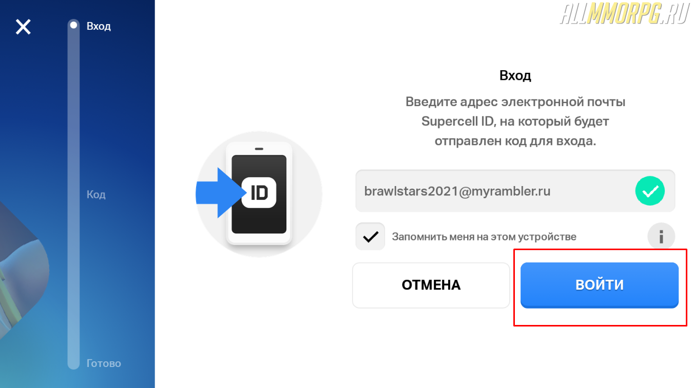 - Введи свой почтовый ящик, на который вы регистрировали Supercell ID. Нажмите «Войти».