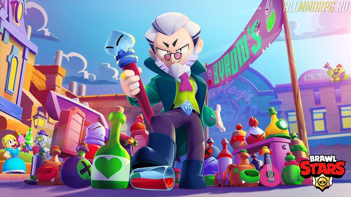 - Байрон. Герой, который наносит средний урон по прямой линии и лечит членов своей команды супер-способностью. Помимо исцеления, супер-способность Байрона наносит неплохой урон вражеским бравлсам.